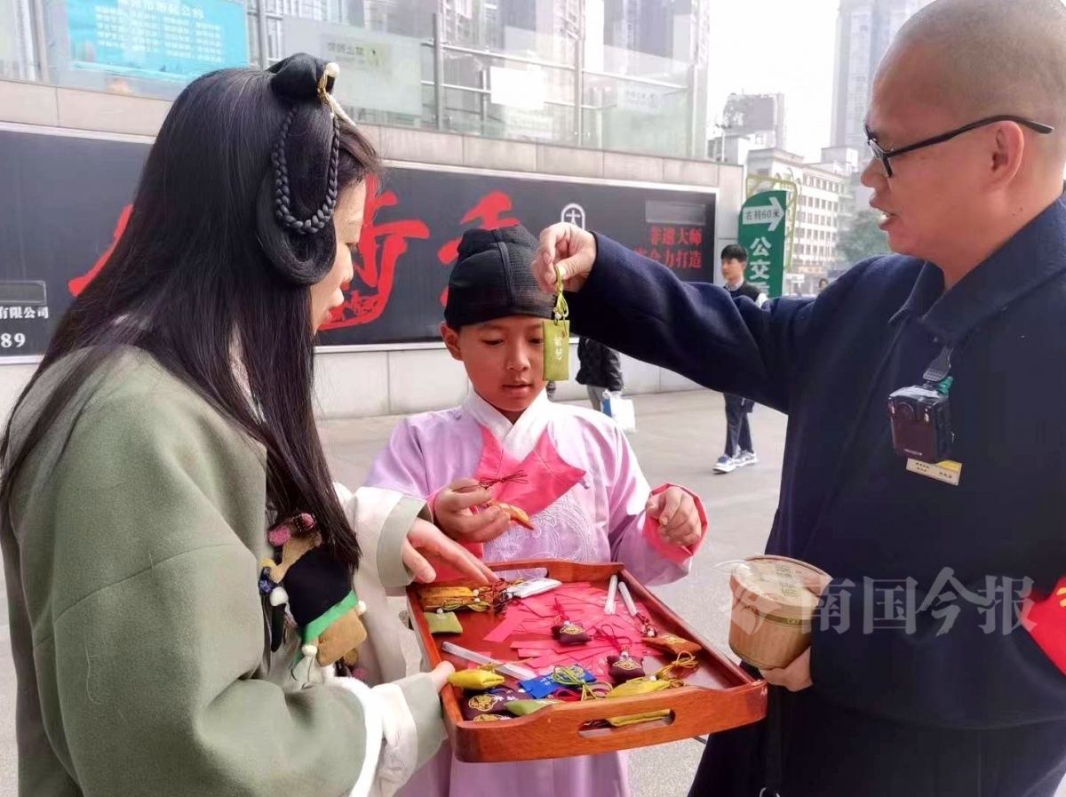 上午9时许,记者来到柳州火车站东广场的紫荆花志愿者服务站,50多名志愿者们已经准备好了满桌的福粥和精美福袋。几位志愿者还穿上了汉服等民族特色服饰,唱起了自编的山歌,欢迎远道而来的游客。广西热情的山歌,吸引了众多刚下火车的游客。