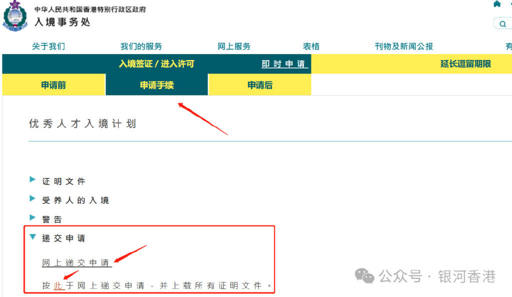 3.递交申请准备好香港优才的申请材料后,就可以到网上递交申请了,优才计划申请网址可以在入境处官网找到,一般【入境签证/进入许可】可以找到优才相关内容。