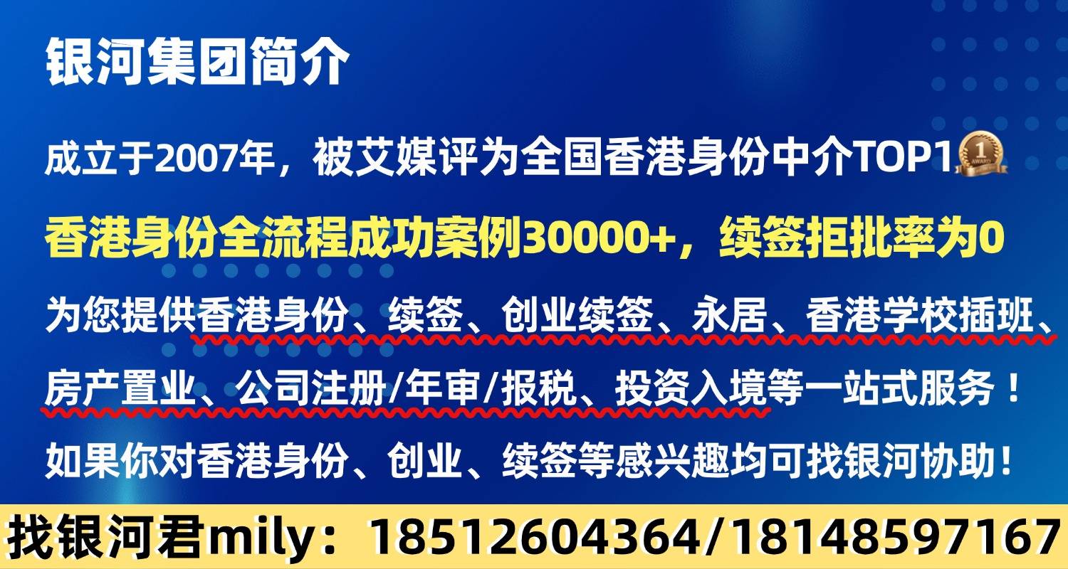 银河集团:专注香港身份18年,被艾媒评为全国香港身份中介排行榜TOP1,香港身份申请到永居全流程成功案例30000+,续签拒批率为0,为您提供香港身份、续签、创业续签、永居、香港中小学插班一站式服务 ,香港身份相关业务随时滴滴银河君mily(微信同号:1814859767或)!